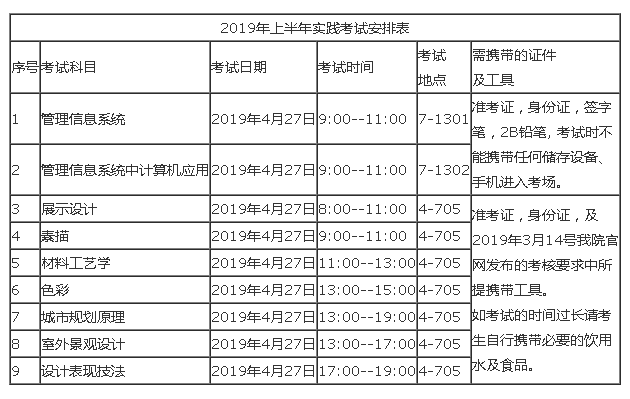 根据2019年上半年自学考试实践课程考核报名情况,本次实践考核课程时间安排、地点通知如下: